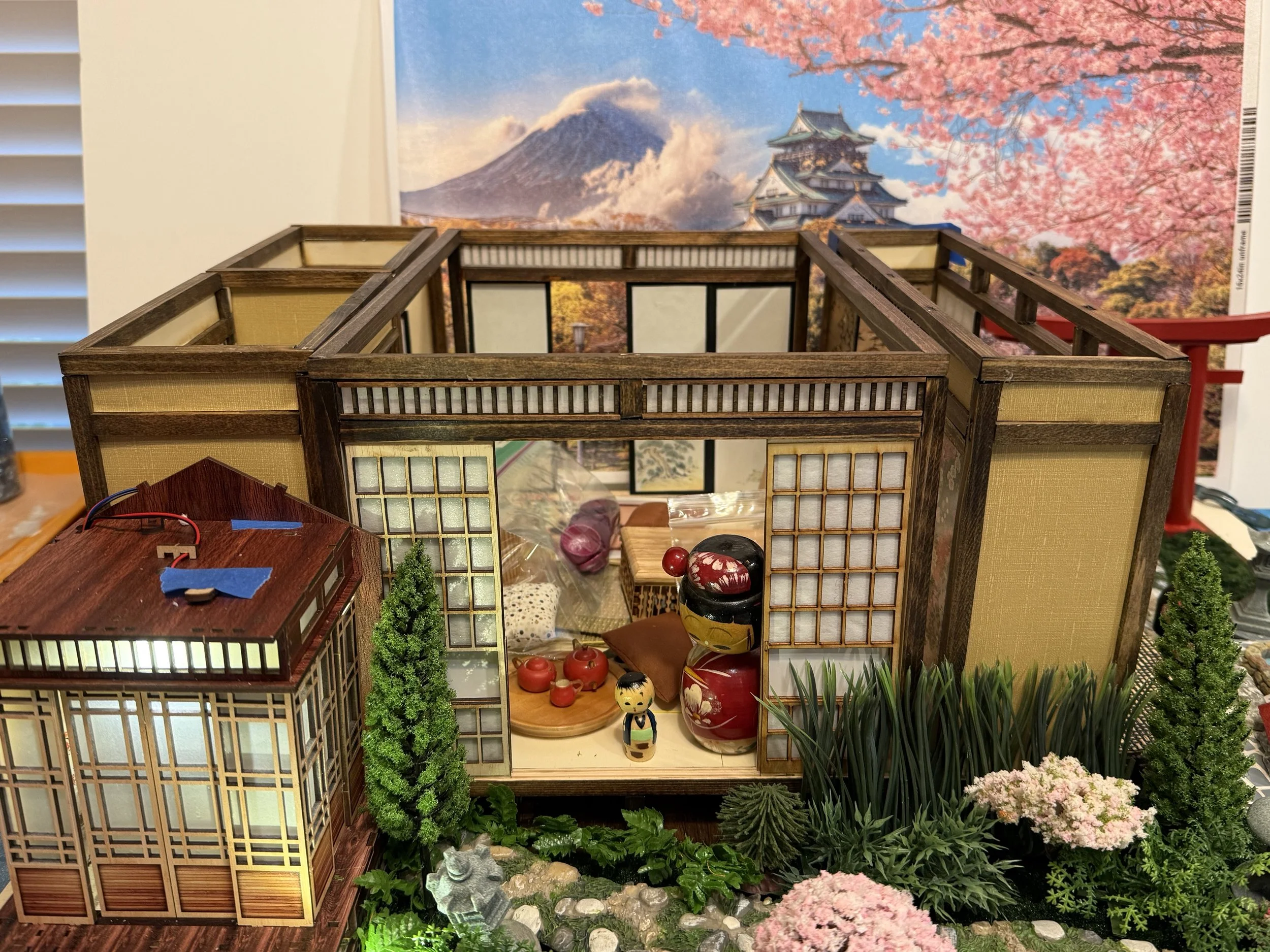 Minimalistic Japanese wooden dollhouse and garden. Bamboo accents, tatami mats, sliding paper/wood doorways. Moss lantern harmony garden.