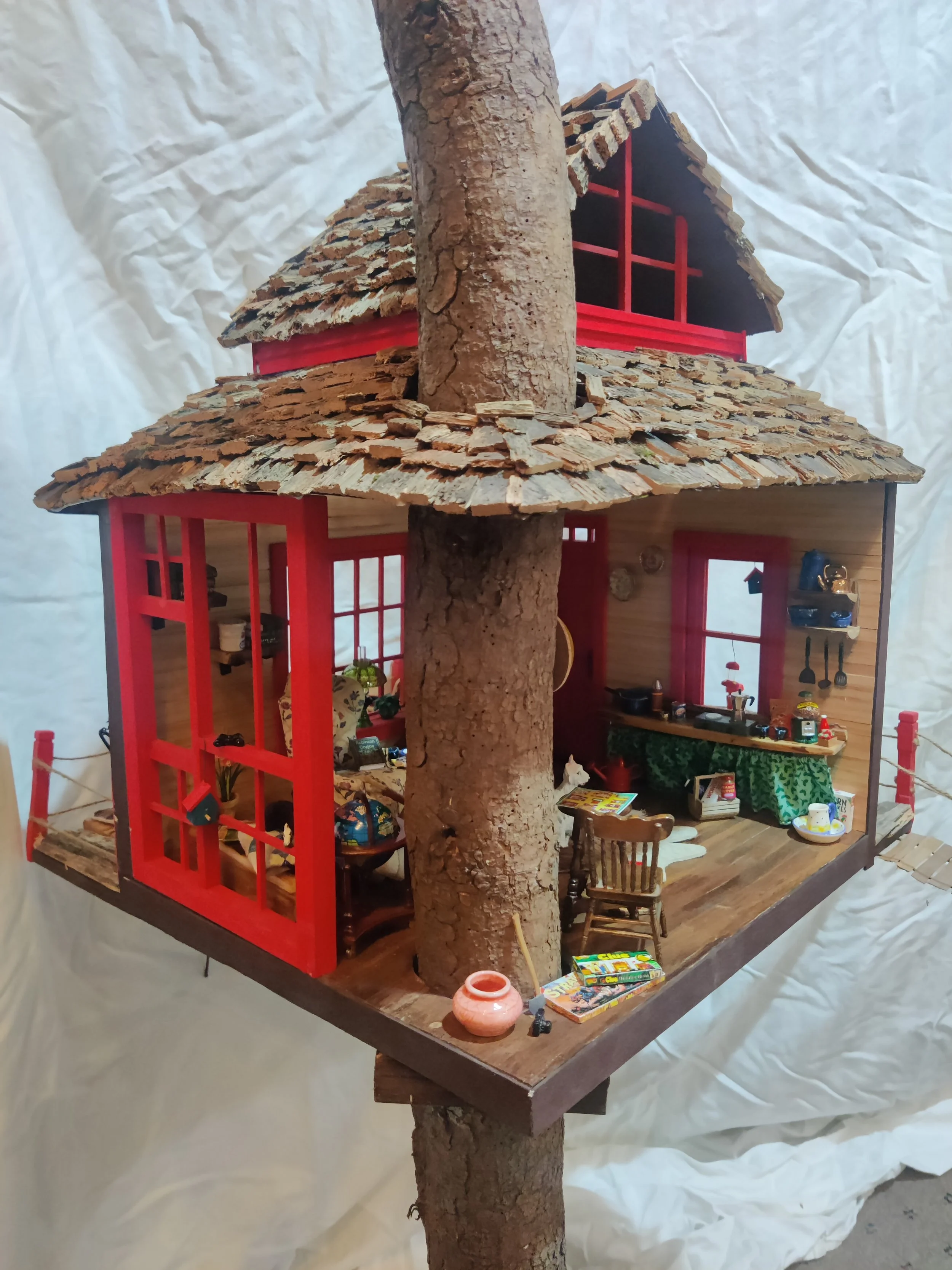 This treehouse, pulling elements straight from nature and sitting on a vintage Christmas tree stand, is an escape from the everyday. Where nature lovers and their pets can relax, read, play games and share meals. Don’t miss the unique details, like the custom roof, bird houses, and hummingbird feeders!