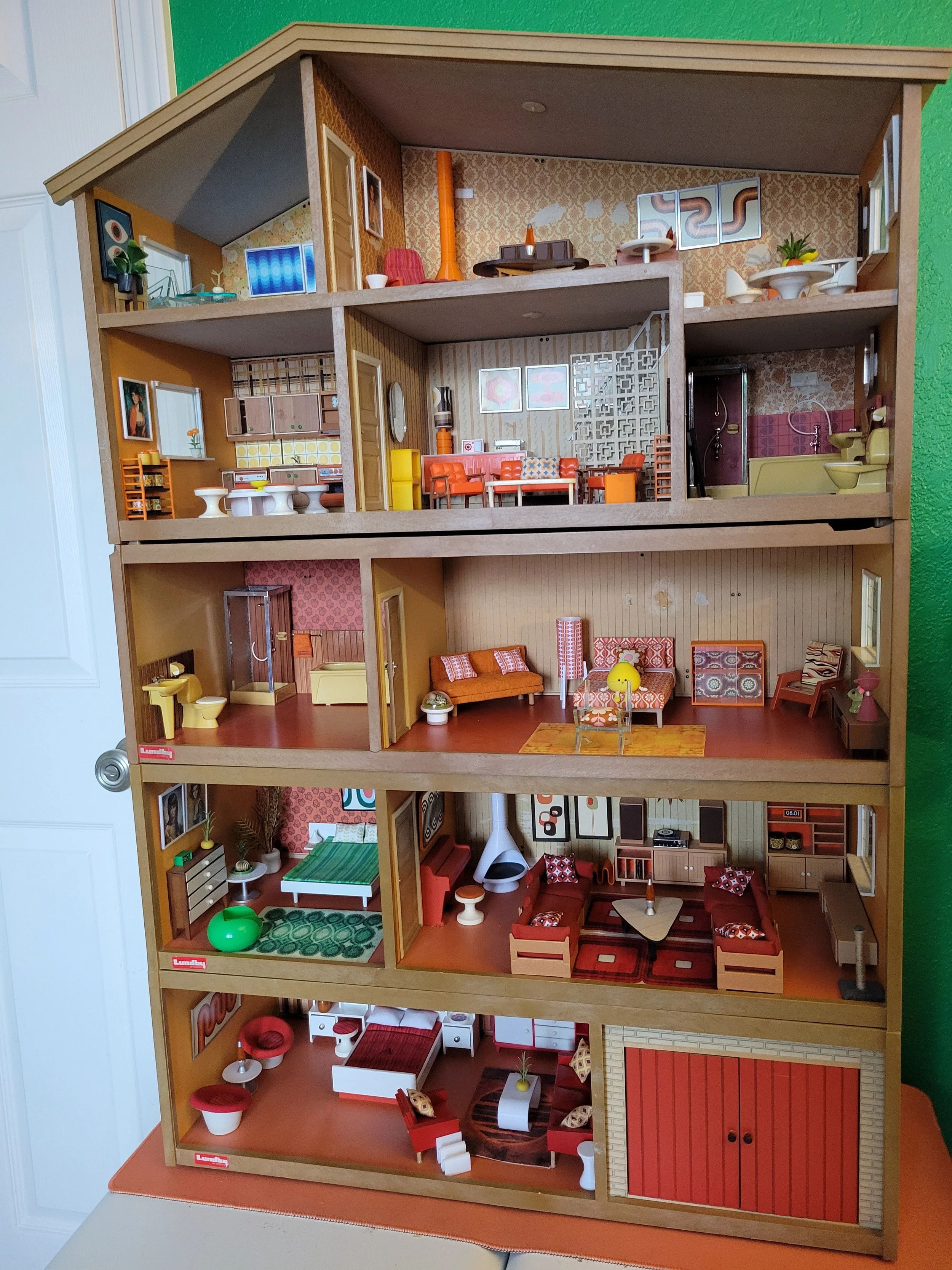 A 1974 vintage Lundby house with extension floors that combines authentic 70s vintage dollhouse furniture from Lundby, Brio, and more with modern 3D printed and laser cut designs.