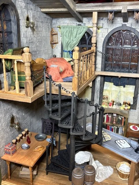 This Glencroft dollhouse has been fully renewed, its original form preserved while its exterior is thoughtfully reimagined. The traditional half-timbered façade has been replaced with a palette of moss green, soft cream, and stone, bringing a quieter, more grounded presence to the structure. In miniature, the house reflects the beauty of considered change—how updating materials and color can shift a familiar form without erasing its history. The past remains present, now steadied and unified, serving as a foundation for renewed life and meaning.